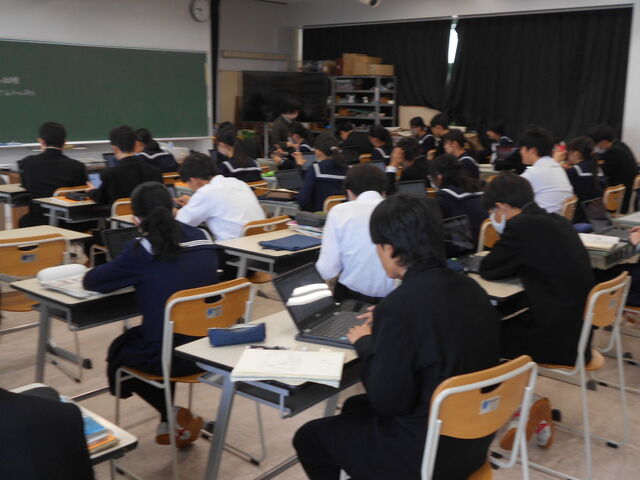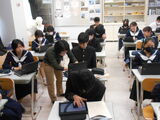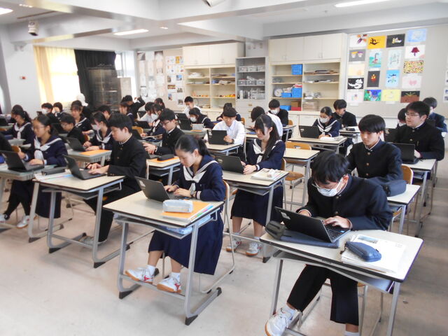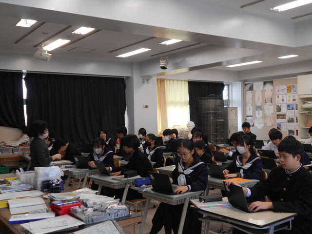 印象に残る分かりやすいポスター作りが佳境に入っています。形や色、構成について自分の作品を見直しながら、丁寧に仕上げをおこなっています。
