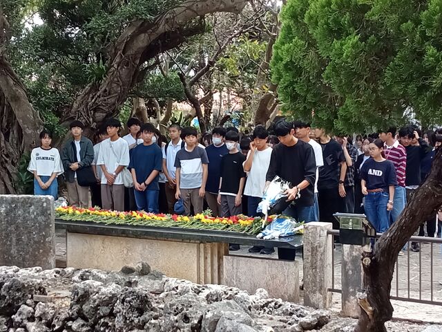 午前中は、糸数壕(アブチラガマ)とひめゆり平和祈念資料館へ行きました。ひめゆり学徒隊をはじめ大戦で犠牲となられた戦没者に献花し、平和への誓いを述べました。