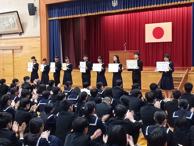 後期始業式に先立って、授賞伝達を行いました。始業式では山根校長先生から「こうなりたい、こうしたいという希望をもって日々を過ごしてほしい。希望があれば、目標に向かって努力することができる。そして、自分の考えを深めたり、新たな計画を立てたりするには文章をよく読んで考える習慣をつけること、読書を大切にしてほしい。」との言葉をいただきました。