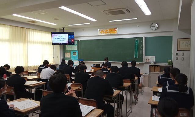 令和7年度後期の活動を振り返り、来年度へつなぐ第3回生徒集会をリモートで各教室で開催しました。各委員会からの報告や生徒会長の挨拶、次期役員の認証・引継式を行い、新たな一歩を踏み出しました。