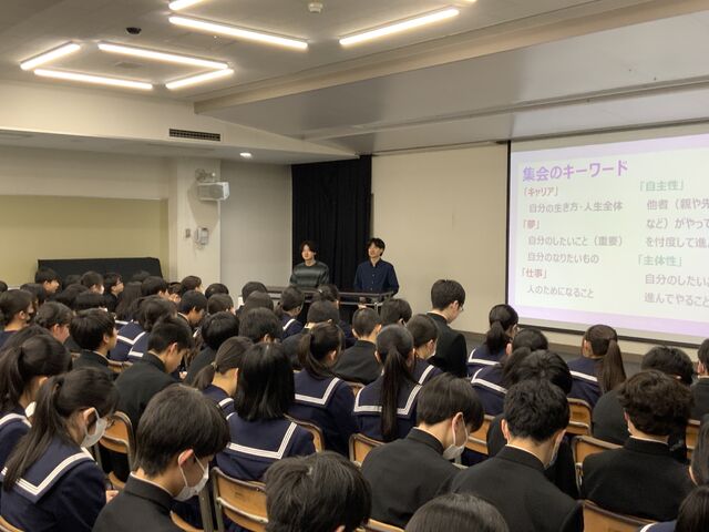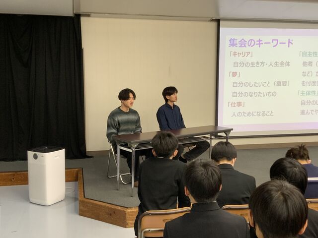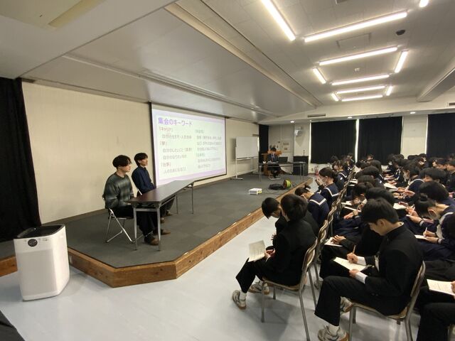 現在大学で学んでいる、本校卒業生2名をお招きして、お話を聞くことができました。中学校生活で何を大事にしてきたか、高校選択についての考え方等について、様々な視点からお話していただきました。メモを取りながら聞き、少しでも自分の成長の糧にしようとしていました。今日のお話が、これからの一人一人の学びにつながることを期待しています。