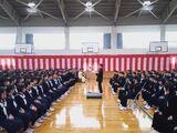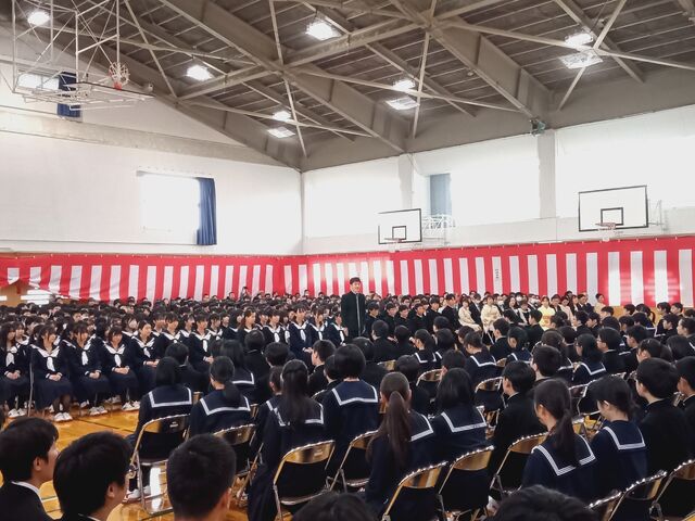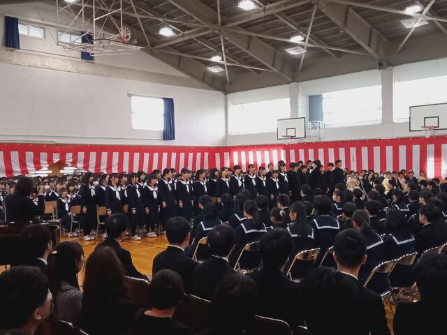 生徒会による対面式が行われました。 生徒会長から歓迎の言葉の後、コーラス部+3年有志による合唱「時の旅人」、2,3年生全員による合唱「大地讃頌」で新1年生をお迎えしました。 その後、新1年生代表者が答辞を述べました。明日から始まる新しい生活に向けてよいスタートとなりました。